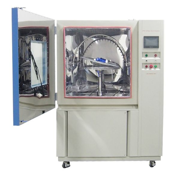 IP X 3, IP X 4 swing tube using stepper motor drive, accurate angle, swing rate can be set and adjusted, each group of nozzles are radiated in the center of the turntable, after the test automatically with compressed air to clean the water stains.